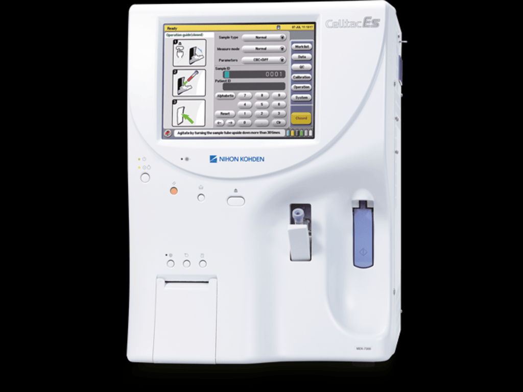 The Celltac ES MEK-7300 is an automated hematology analyzer designed for simple yet precise blood analysis. It offers advanced statistics for enhanced reliability in WBC and PLT measurements. With a large touch screen, auto priming, and self-cleaning, it ensures stress-free operation. Its streamlined workflow supports multiple modes and requires only a minimal sample volume. Manufactured by Nihon Kohden and distributed by S.R. Biomedicals, it's a compact and efficient solution for clinical labs.